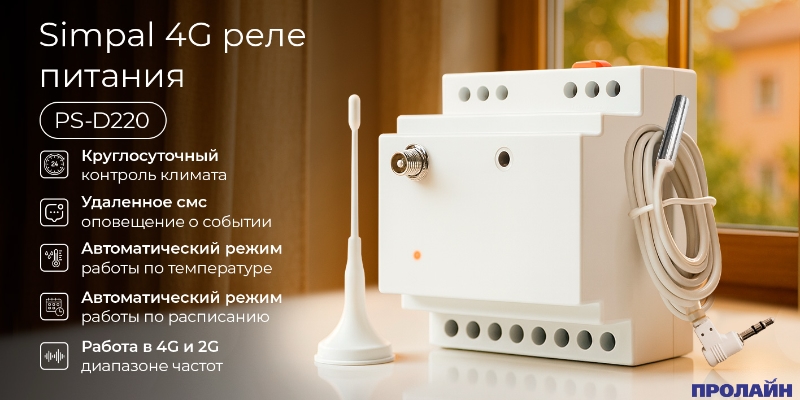 Контроллер питания GSM 4G на DIN рейку с управлением по СМС и звонку, 16А с нагрузкой 3.5 кВт, контакты для датчиков SimPal-D220