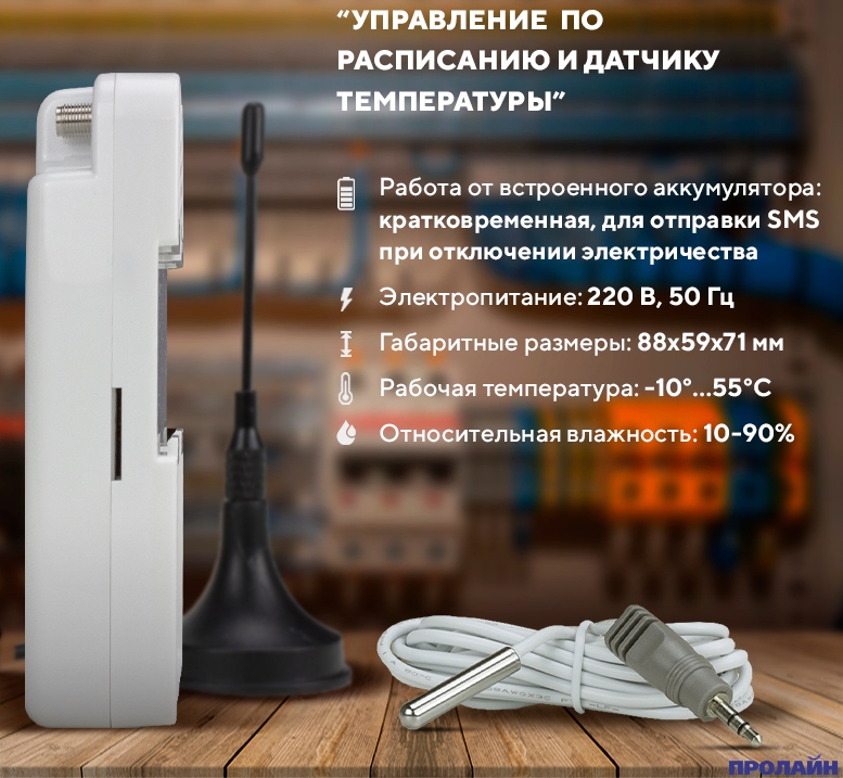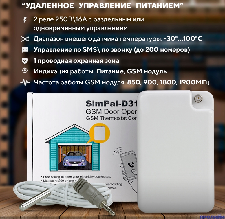 В комплекте с SimPal-D310 идет проводной выносной датчик температуры типа DS18B20, который можно установить в помещении для контроля изменения в нем температуры воздуха в пределах от -30 до +100 градусов. При подключении и настройки этого датчика температуры и превышении заданного порогового значения, происходит уведомление пользователя в виде SMS сообщения. С помощью SMS команд можно управлять и настраивать режимы работы, в том числе и по расписанию. Таким образом можно выставить расписание включения или выключения подключенного к устройству оборудования. Для поддержания заданной температуры, устройство может автоматически управлять включением или отключение системы отопления или кондиционирования. Отправив SMS команду, можно в любой момент проверить текущую температуру и уровень приема GSM сигнала. Подключение в охранную зону проводного датчика, расширяет применение устройства и позволяет получать тревожные SMS уведомления при срабатывании, например, датчика утечки воды или датчика открытия двери с NO/NC типами контактов или PIR датчика движения.
